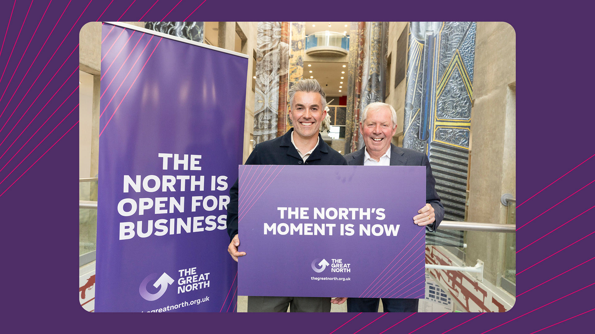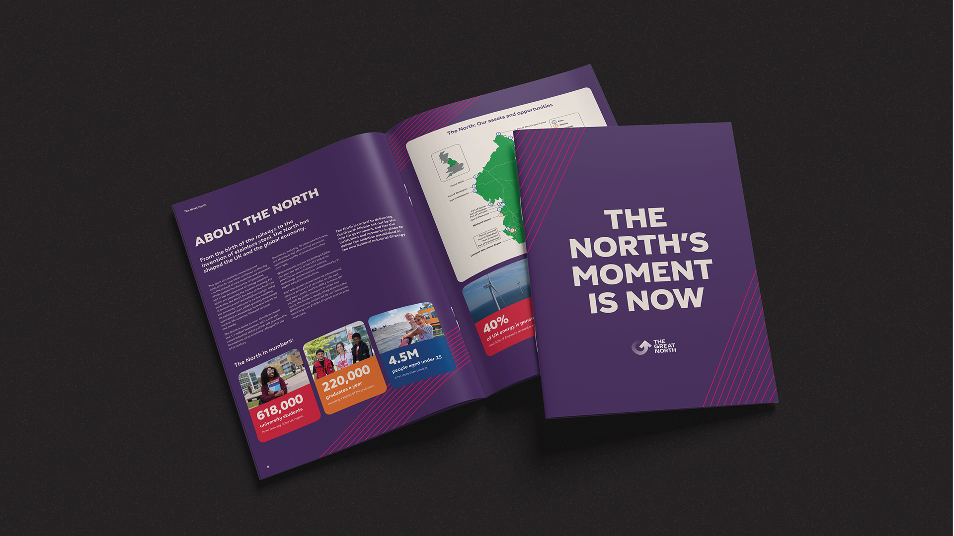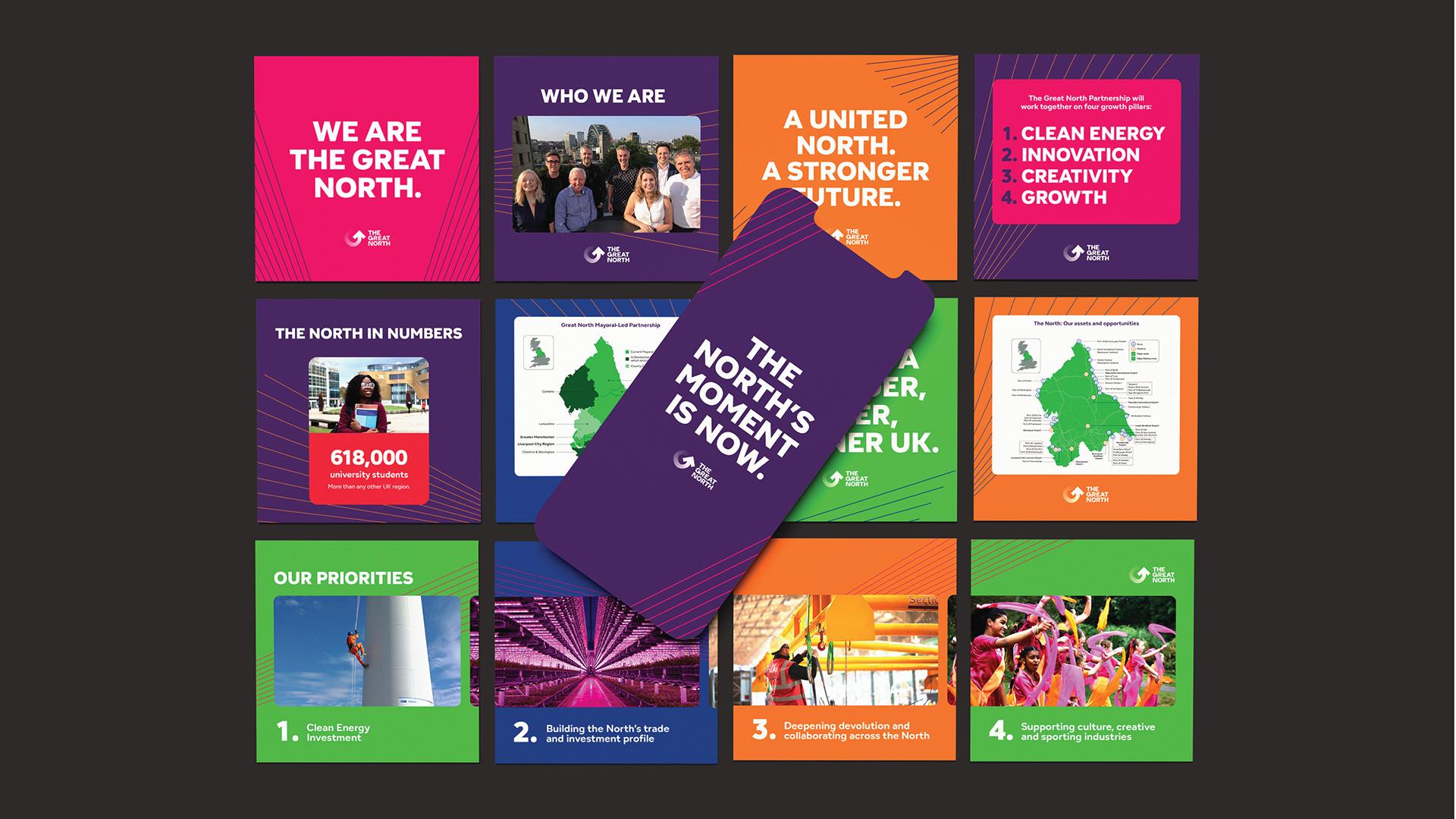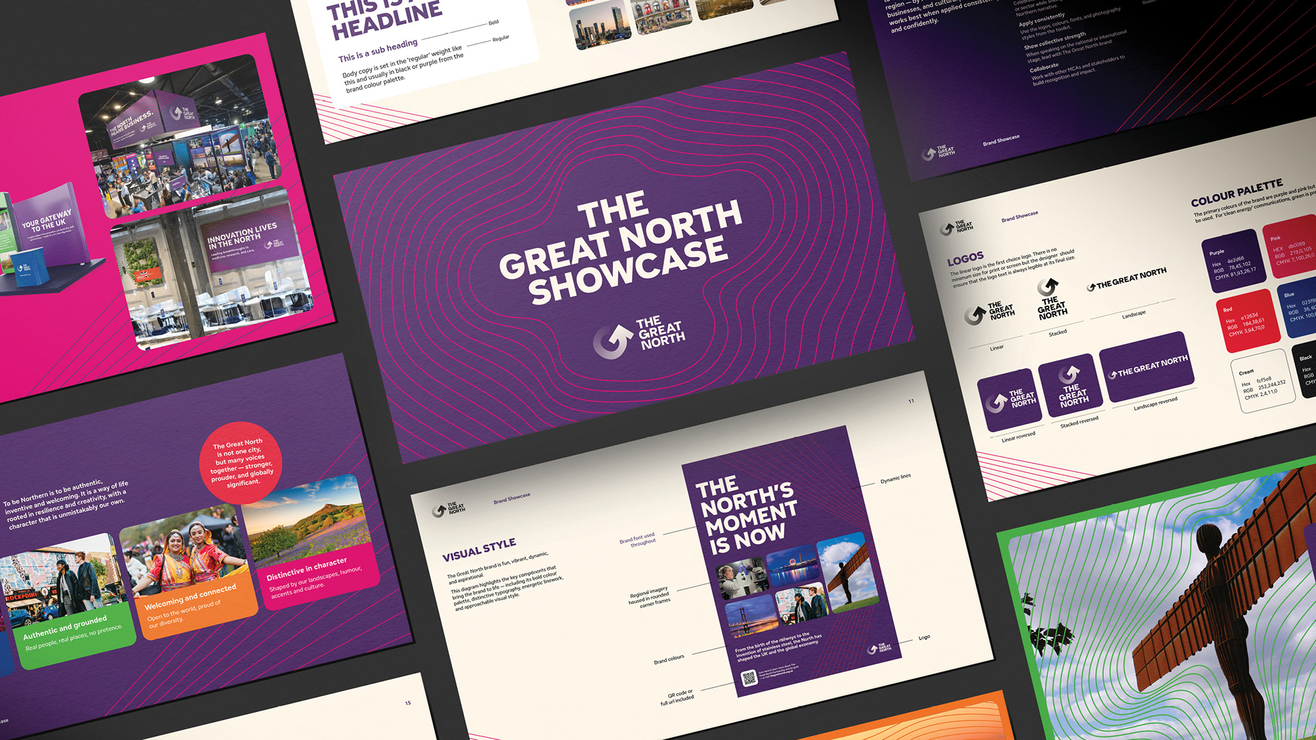 When Ben and Viv took on The Great North, the foundations were there. We transformed it into a more exciting, dynamic brand — energising the colour palette, elevating the typography and introducing graphics that added movement and momentum. From events and brochures to socials, templates and partner tools, we shaped a confident, cohesive identity built to travel far.