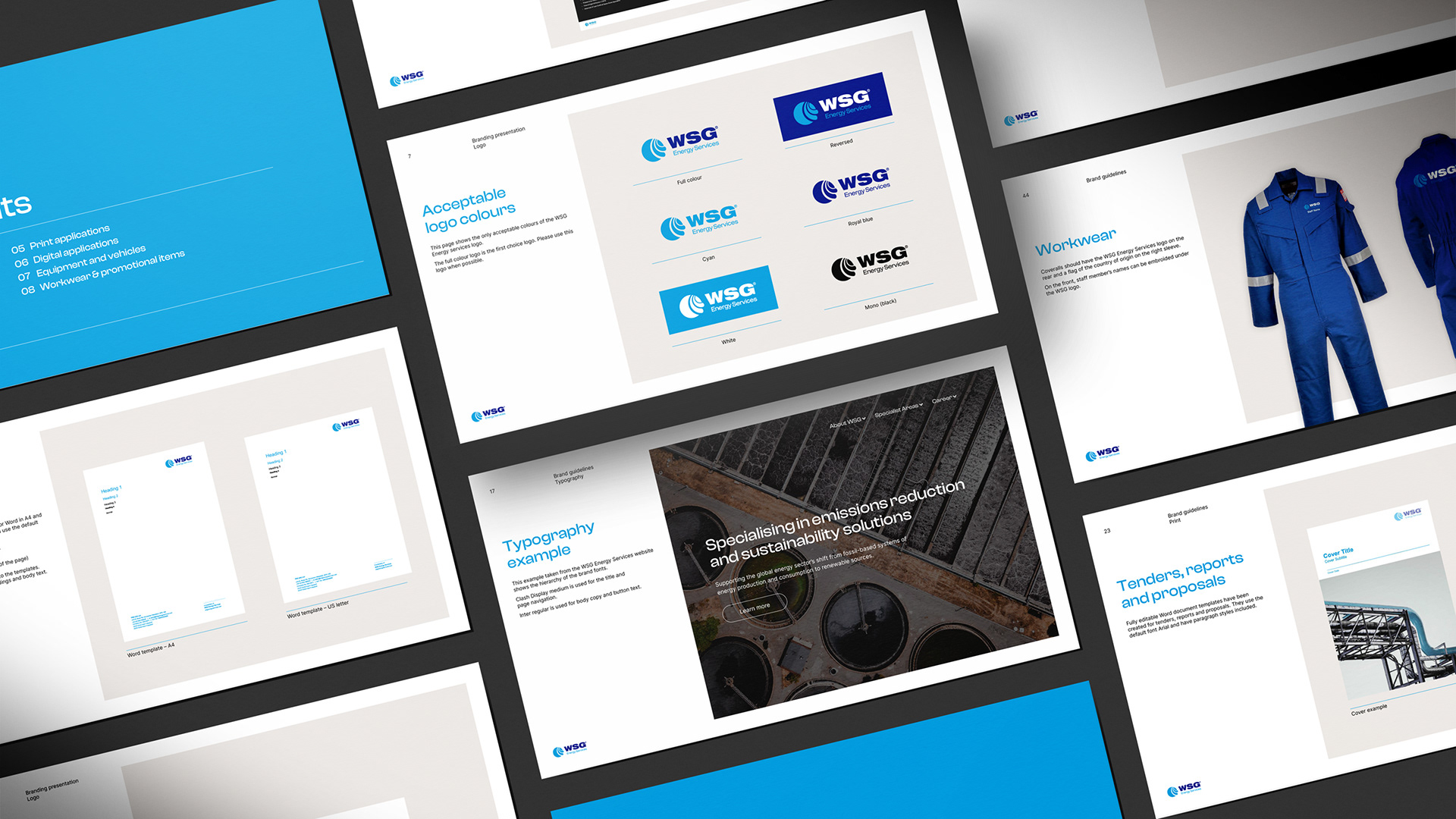 When WSG shifted its focus to sustainable energy, it was the perfect time for Ben and Viv to refresh the brand. They standardised the logos and sub-brands, introduced modern typography and refined the colour palette. They created new design standards for all collateral across print and digital – all brought together in a comprehensive set of brand guidelines.